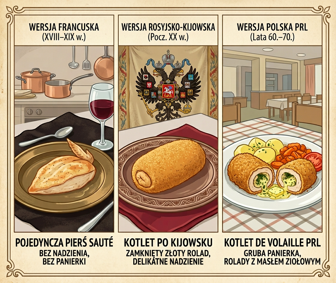 Faszerowany i panierowany Kotlet de Volaille czyli z kurczaka to efekt mariażu francuskiej kuchni wysokiej (haute cuisine) z rosyjsko‑ukraińską kuchnią dworską, który do Polski trafił jako spolszczona wersja tego, co świat zna dziś jako Chicken Kiev. Zaczęło się na przełomie XVIII i XIX wieku, gdy rosyjscy arystokraci intensywnie importowali modę na kuchnię francuską: zatrudniali francuskich szefów i wysyłali swoich kucharzy na staże do Paryża. W tym kontekście pojawiły ...