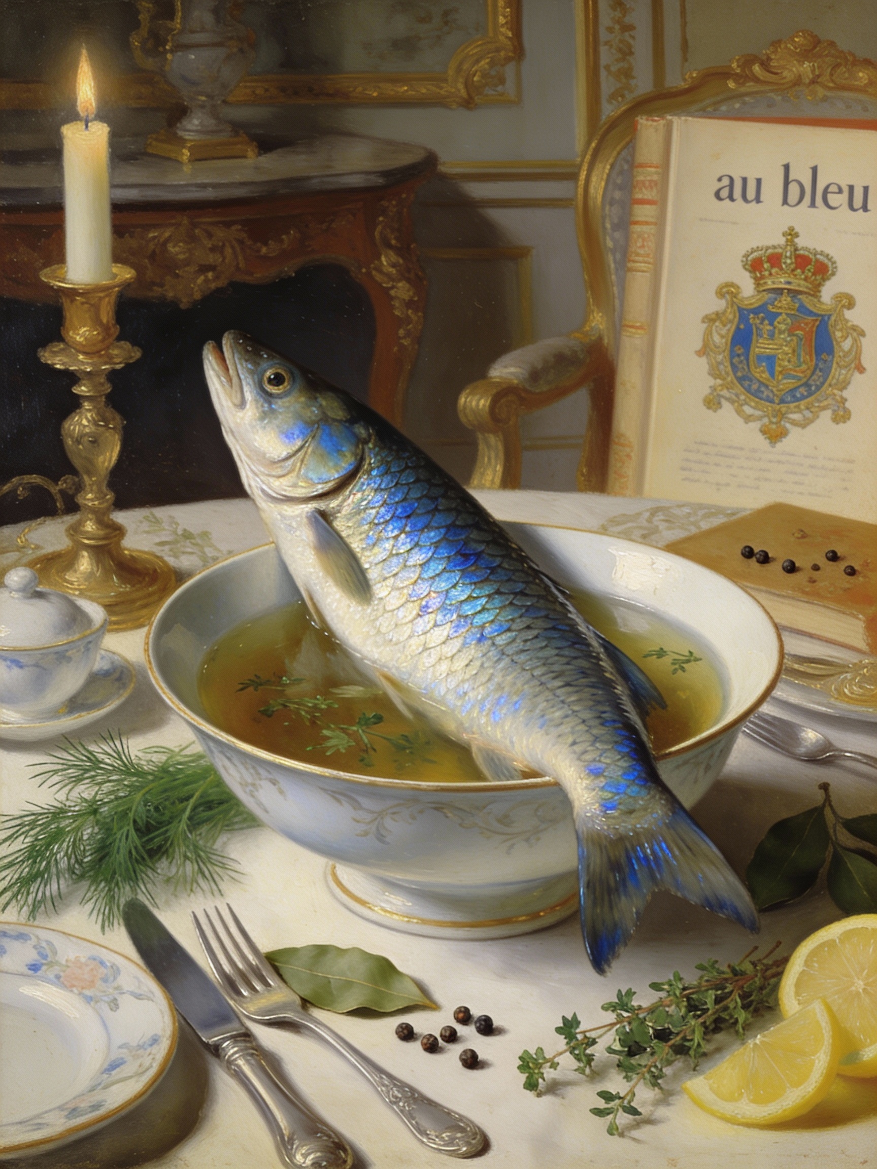 FR: „Prenez un beau Brochet tout en vie & le fendez par la moitié; ensuite coupez-le par morceaux de quatre pouces de large vous prenez du gros sel, que vous jettez du côté des écailles, qu’il en soit tout couvert ; un quart-d’heure aprés, vous aurez du bon vinaigre tout boüillant, dans lequel vous mettrez une pincée de poivre, que vous jetterez par-dessus, qui est ce qui lui donne un beau bleu, Vous le mettrez dans une caſſerole, ou autre vaiſſeau, où vous le ferez cuire avec thim, basilic, laurier, oignons en traaches, persil, ciboules hachées, cloux de gerosle, poivre, & y mettez de l’eau suffisamment pour qu’il trempe de trois doigts au dessus du poisson, que vous mettrez dedans avec tout son asaissonnement où il a trempé: vous le ferez cuire à grand feu, & le servirez avec ſes écailles; vous ferez une sausse rien que de beurre, & environ demie livre d’anchois, du gros poivre; vous la fervirez dans une jatre à part.”